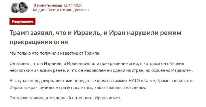Трамп обвинил Израиль и Иран в нарушении перемирия. Трамп заявил, что Израиль и Иран нарушили режим прекращения огня, передает Reuters. Он выразил недовольство обеими сторонами, но особенно Израилем. Президент США также высказал мнение, что ядерный потенциал Ирана исчерпан и он «никогда не восстановит свою ядерную программу». Trump wirft Israel und dem Iran Verletzung des Waffenstillstands vor. Trump sagte, Israel und der Iran hätten den Waffenstillstand verletzt, berichtet Reuters. Er äußerte seine Unzufriedenheit mit beiden Seiten, insbesondere mit Israel. Der US-Präsident äußerte zudem die Ansicht, das nukleare Potenzial des Iran sei erschöpft und das Land werde sein Atomprogramm niemals wieder aufnehmen.
