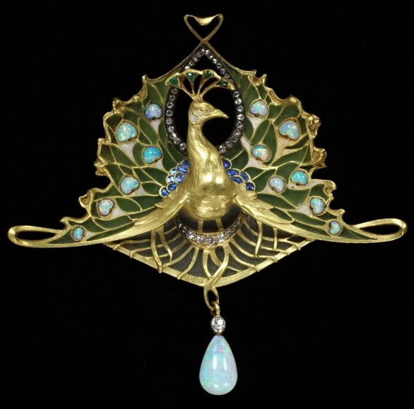 Золотая подвеска в виде павлина, украшенная витражной эмалью, бриллиантами, опалами и изумрудами, работы Л. Готре (1965-1937), Франция, около 1900 г.
