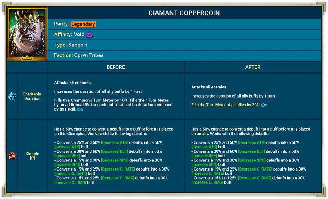Анонсировали ребаланс Диаманта и Андрока Диамант А2 - Жертва во благо Атакует всех врагов. Продлевает действие всех бонусов команды на 1 ход. Заполняет шкалу хода всех союзников на 20%. Вор в Законе (пасс) С вероятностью 50% изменяет штраф на бонус, прежде чем враг накладывает его на союзника. Работает для таких штрафов: - Штраф атаки 25% и 50% меняется на Бонус атаки 50%; - Штраф защиты 30% и 60% меняется на Бонус защиты 60%; - Штраф скорости 15% и 30% меняется на Бонус скорости 30%; - Штраф крит. шанса 15% и 25% меняется на Бонус крит. шанса 30%; - Штраф крит. урона 15% и 25% меняется на Бонус крит. урона 30%. Андрок Славнейший Базовая форма А1 - Укус Гордости Атака по врагу. Накладывает на команду Бонус защиты 60% на 1 ход. Множитель урона увеличен. А2 - Опора Веринбура Накладывает на команду Бонус сопротивления 50%, Усиление 25% и Регенерацию 15% на 2 хода. Союзники, у которых меньше 50% здоровья, получают дополнительную Регенерацию 15% на 2 хода. Также заполняет шкалу хода все