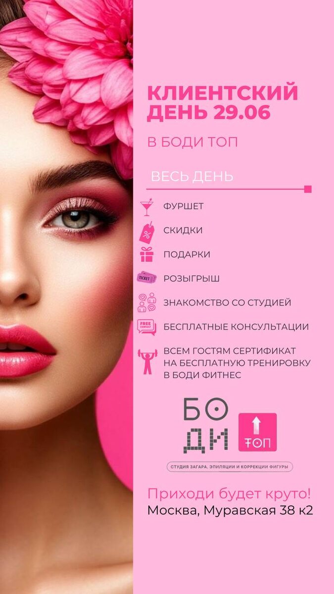 Клиентский день в Боди топ 🎉 📅 Дата: 29 июня❗️ 📍 Адрес: Муравская 38к2 Дорогие друзья! 💖 Приглашаем вас на яркое событие — клиентский день в студии Боди топ! Что вас ждет? 🌟 🥳 Фуршет, где можно вкусно перекусить! 💸 Скидки на услуги студии! 🎁 Подарки для всех участников! 🎉 Розыгрыш призов! 🤝 Знакомство с нашей студией и командой! 📞 Бесплатные консультации по фитнесу и здоровью! 💥 И не забудьте! Всем гостям мы вручаем сертификат на бесплатную тренировку в Боди фитнес! Не упустите возможность провести время в компании позитивных людей и отдохнуть душой и телом! 💪 Ждем вас в Боди топ! 🚀