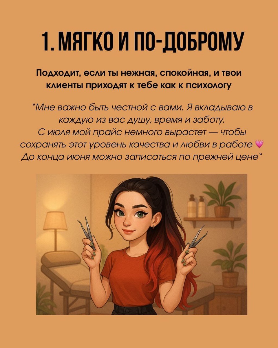 3 важнейших момента в повышении прайса: ✅ забываем про неудобно/неуютно/страшно — ваша цена отражает вашу ценность. если вам страшно уверенно произнести цену, нужно работать над собой и своей самоценностью. помните, что залог возвращаемости ваших клиентов — ваша уверенность в цене ✅ говорим о повышении каждому клиенту лично! даже если вы предупредили в переписке, повторяем вживую. когда вы говорите своим голосом, вы передаете не только информацию, но и свои чувства, отношение к клиенту, эмоции. человек возвращается в том числе из-за этого ✅ готовьте клиента заранее к повышению цены. он должен знать вашу систему повышения прайса и быть готовым к этому. например, периодически упоминайте в контенте или в разговоре, что для вас повышать цену на 500₽ раз в год — нормальная практика