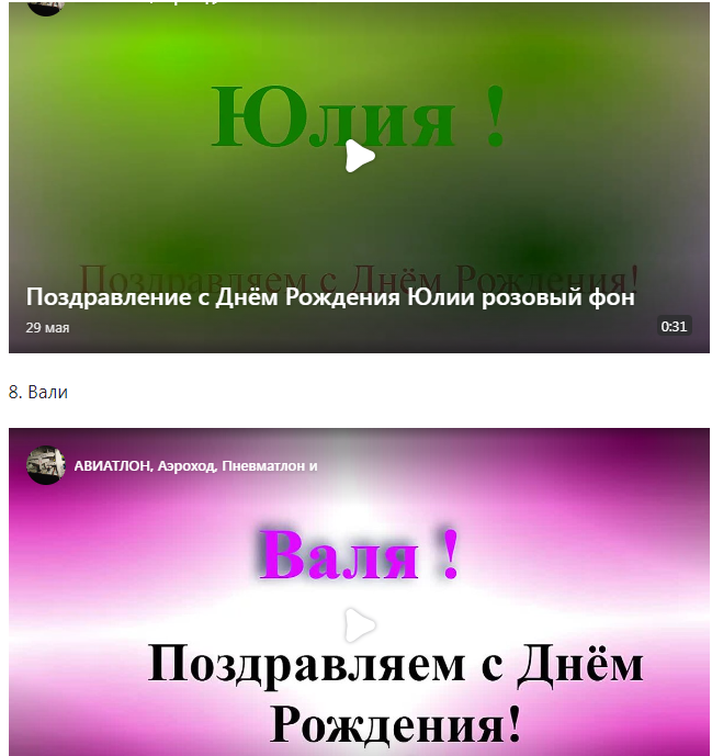 Поздравления выполнены в качестве небольшого красочного видеоролика содержащего имя, которому посвящено поздравление, и стандартный текст: Поздравляем с Днём Рождения. Любым поздравлением Вы можете поздравить Вашу маму, бабушку, тётю, супругу, подругу просто поделившись с ней соответствующей публикацией. Ну а теперь сами поздравления, встречайте: 1. Айгуль 2. Арина 3. Арсения 4. Ариадна 5. Александра 6. Ани 7. Юлии 8. Вали 9. Кати 10. Фёклы Надеюсь Вам понравились эти поздравительные материалы. Прошу Вас нажать "нравиться" и посоветовать мой канал своим друзьям. Спасибо за внимание. До свидания!