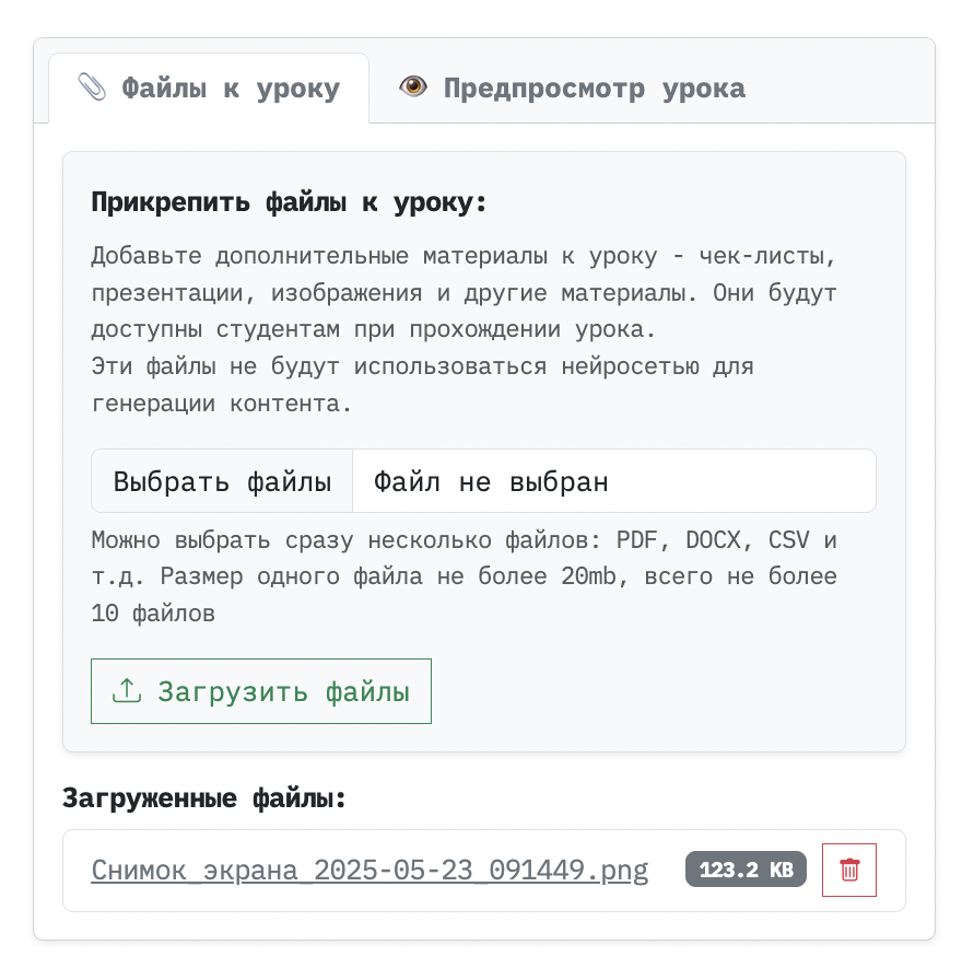 AI Тьютор v1.7 - Загрузка файлов к AI уроку в режиме Creator