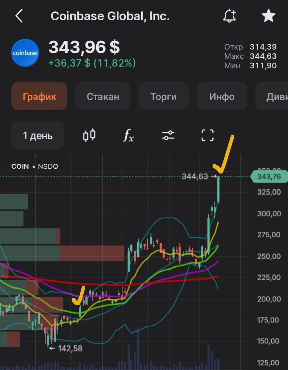 Пример - акции биржи #COIN Coinbase, которые дают +80% прибыли за 2 месяца или 480% годовых.