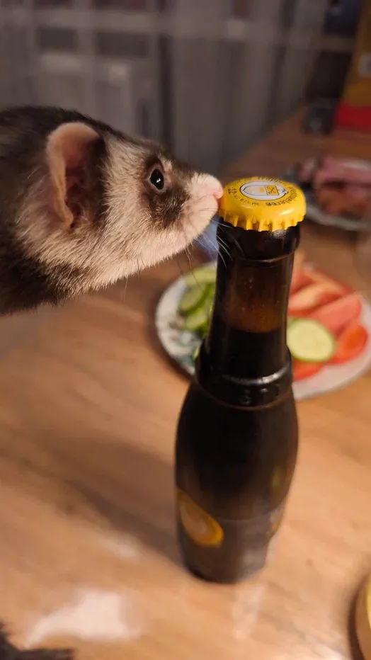 Что ж, пора и нам продегустировать и сравнить свои ощущения с мнением профессионалов. Бутылка незамысловатая. Прошлый раз я его пробовал в 2020 году. Раньше этикетки не было, а в 2025 году появилась. Форма бутылки и объем остались прежними. Отбираем бутылку у хорька (хорёк-алкоголик - горе в семье) и открываем!