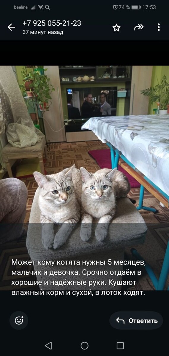 Братик с сестричкой ищут дом! Заботливые ручки, откликнитесь, пожалуйста! Всем доброго времени суток! Увидев данное объявление, не смогла остаться равнодушной и не посодействовать распространением информации о поиске хозяев этим чудесным котоподросткам. Телефон для связи с хозяйкой милашек близняшек-двойняшек: 89250552123 P. s.: Нашего Басика в свое время приобрела, когда ему было 4 месяца и ничуть не пожалела о таком большеньком котеночке🙂
