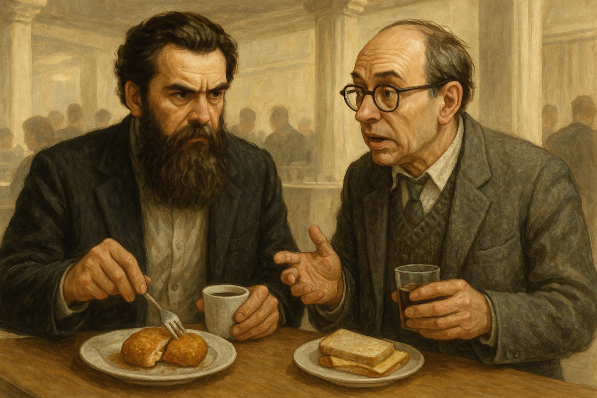 В буфете правительственного здания весело звенели посудой. Человек с длинной густой бородой и умными глазами тоже звенел. Он в одиночестве стоял за высоким столиком, пил кофе и тупым ножом пытался расчленить котлету «по-киевски». – Разрешите? – послышался вежливый голос. Оторвав взгляд от котлеты, бородач взглянул на незнакомца. К столику подошёл невзрачный человек с залысиной и в толстых очках. Он походил на советского инженера, в особенности своим заношенным серым костюмом и вязаной безрукавкой под пиджаком. Бородач сделал жест рукой, и советский инженер превратился в его соседа. У незнакомца тоже был стаканчик кофе, но на закуску только бутерброд с сыром. – Вы ведь Фёдор Антонович Благоветров? – вдруг спросил неизвестный. Благоветров поднял голову и, точно артист, услышавший своё имя, принял заученную позу: нарочито ссутулился, в глазах появился оттенок глубокой мысли, лоб прорезали морщины. – Да, – ответил он с достоинством и, как всякий человек, привыкший к многословным выступлени