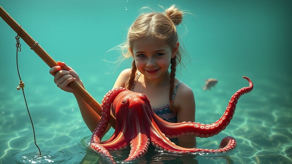 Юля обожала приключения. Когда её дедушка предложил поехать на рыбалку к морю, она даже не раздумывала. Всю дорогу она представляла, как будет ловить огромных рыб, а может, даже найдёт затонувший пиратский клад. Но реальность оказалась… страннее. Неожиданная рыбалка. Утро началось отлично: дедушка расставил удочки, Юля помогала насаживать червей, а море плескалось ласковыми волнами. Но клёва не было. — Может, рыбы сегодня спят? — вздохнула Юля. — Или что-то их спугнуло, — нахмурился дедушка. И тут вода у берега вдруг забурлила. Из волн вылезло что-то скользкое и щупальцевое. — Осьминог?! — ахнула Юля. Но не один. За первым показался второй, третий… Целая армия осьминогов выползала на берег, сверкая злыми глазками. Битва на песке. — Они что, на нас нападают?! — закричала Юля, хватая сачок. — Видимо, мы заняли их любимое место! — ответил дедушка, размахивая удочкой. Один осьминог обвил щупальцем её ногу. Юля вскрикнула и ударила его пустой банкой из-под