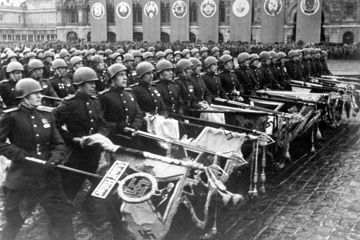📌По указанию Генерального штаба в Москву из частей 1-го Белорусского и 1-го Украинского фронтов (из Берлина и Дрездена) доставили около 900 единиц трофейных знамен и штандартов. 200 знамен и штандартов, отобранных затем специальной комиссией, были помещены в специальную комнату и взяты под охрану. В день Парада Победы🎖 их на крытых грузовых машинах доставили на Красную площадь и вручили личному составу парадной роты «носильщиков». Пока войска на Параде 🥇🎖шли по Красной площади, их движение сопровождал гигантский оркестр численностью 1400 музыкантов. И вдруг оркестр смолк, и в этой тишине начали бить 80 барабанов. Вперед вышла особая рота с двумя сотнями вражеских знамен. Полотнища их почти волочились по мокрой брусчатке площади. У подножья Мавзолея находились два деревянных помоста. Поравнявшись с ними, бойцы делали поворот направо и с силой бросали на них гордость третьего рейха. С глухим стуком падали древки. Полотнища устилали помост. Трибуны взорвались аплодисментами. Дробь