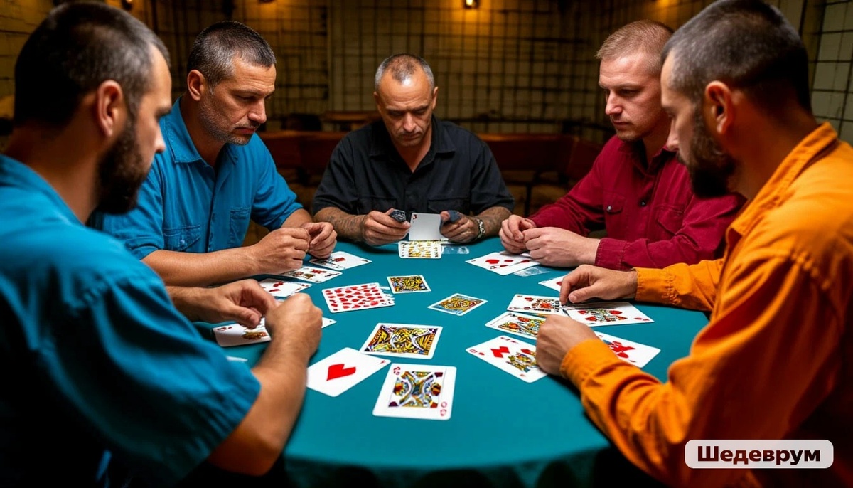 Лицо Саши словно скрутилось, странно вытянулось и съёжилось, а его глаза были закрыты тенью нахмуренных бровей. Смех Коли раздался по темнице. Саша лёгким движением взял карты, Джимм, Гарри и Чеполино тоже взяли карты. Джимму попались десятка пик и дама крестей. Игра продолжилась. “Чеполино” слегка потупил взгляд, разглядывая карты в руке, но быстро кинул валета пик. На это “Бородатый Колян” подкинул валета червей. Маленький Гарри даже слегка задрожал, но, хорошенько разглядев свои карты, он мгновенно подкинул бубнового валета. Джим посмотрел в свои карты, он подумал: “Да! Повезло же. Как раз недостающий валет крестей.” - и подкинул валета. Подошла очередь “Саши Костелома”. Он посмотрел на стол и, удивлённо подняв брови, внимательно начал разглядывать карты. В тот момент Джим подумал: “Неужели он опять возьмёт!?”, но вдруг лицо Саши застыло в улыбке во все зубы, и он отбил всех валетов дамами пик, червей и бубен, а валета крестей отбил тузом крестей. Лицо “Чудного Джимма” было изумлённ