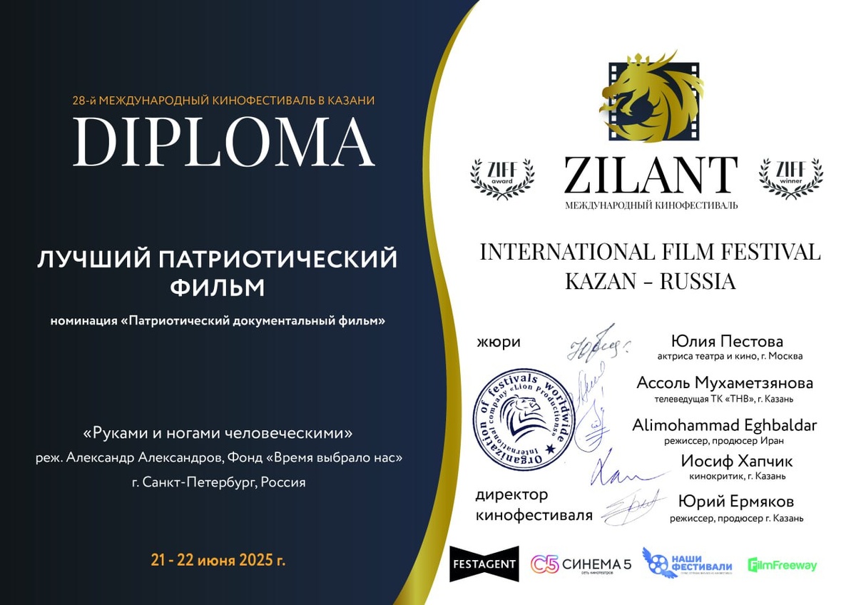 С радостью сообщаем вам, что фильм «Руками и ногами человеческими» выбран как ЛУЧШИЙ ПАТРИОТИЧЕСКИЙ ФИЛЬМ в номинации «Патриотический документальный фильм»!