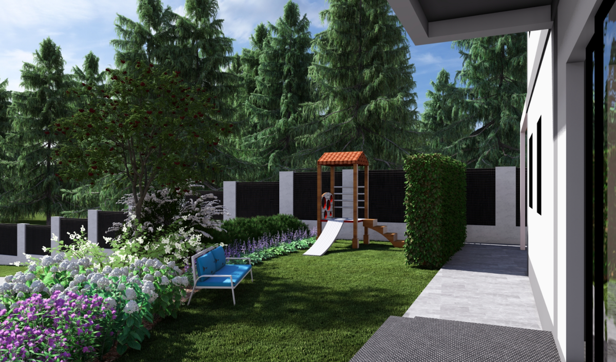 Поэтому мы с моей коллегой (и бывшей ученицей) решили пойти дальше и создали 3D-визуализацию новогоднего сада. Под конкретный участок. С учетом всех нюансов рельефа, климата, предпочтений семьи.
