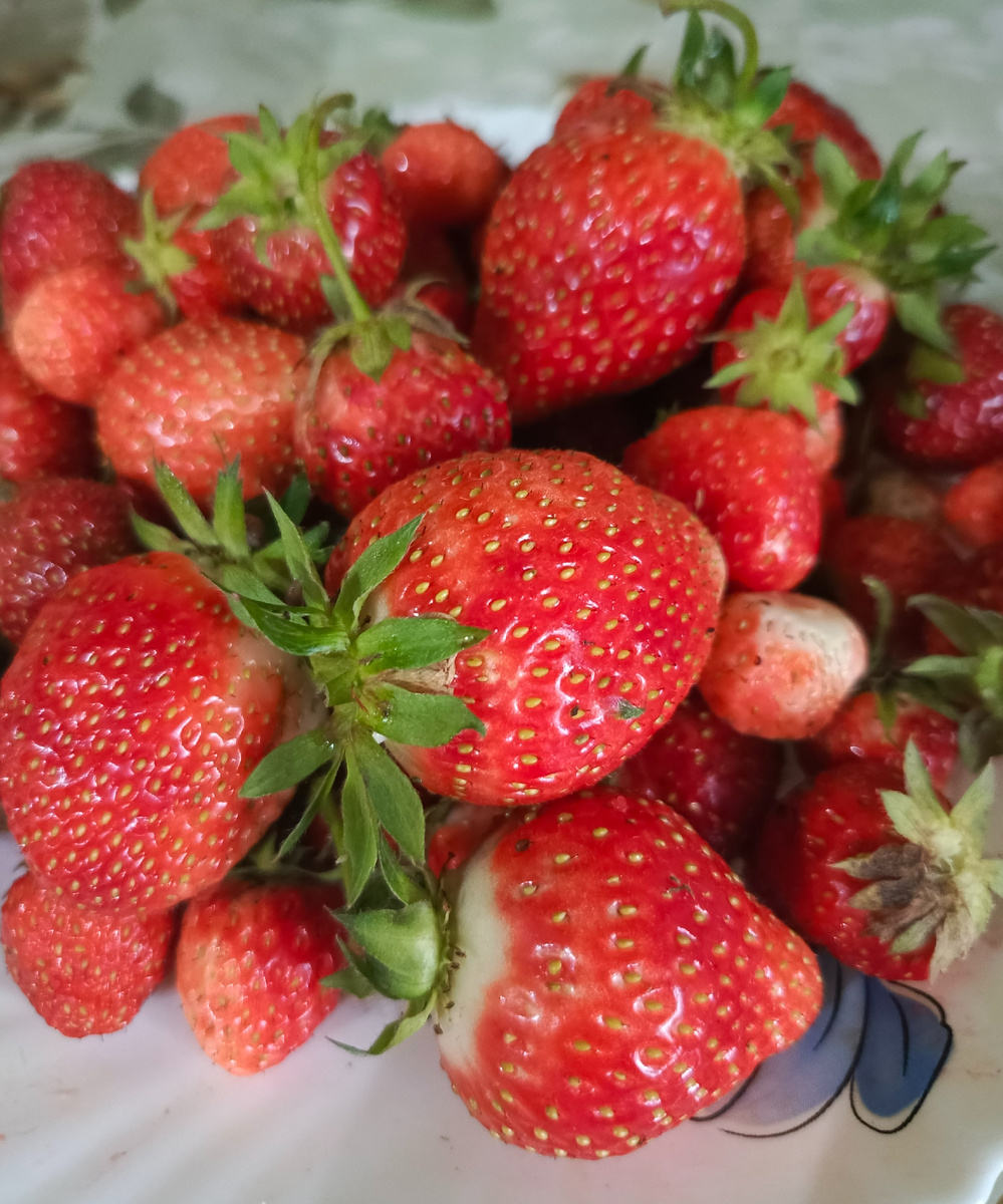 Даже не поругались, просто муж уж очень обидчивым стал😏 Я просто предложила в сложившихся погодных условиях свой план действий, который муж не одобрил🤔И выдал мне, мол, я даже когда умру, ты меня в покое не оставишь, будешь требовать, чтоб я лег правильно) Ну тут уж я обиделась🤭Видишь ли, занудой меня посчитал или пилой🫣 Разошлись по своим делам. Я ушла собирать очередную партию клубники.Дарина в предвкушении получения заказов с Вайлдберриз пошла расхламлять шкаф с одеждой. Обидчивый муж ... уехал на рыбалку🫣 Собрала литра три клубники. Из крупной крепенькой закатала банку компота. Естественно, для Алекса. Остальную размяла толкушкой, добавила чуток сахару и залила в бутылки из-под молока, чисто вымытые и высушенные, и заморозила. Коллега приносила таким образом приготовленную малину, очень вкусная, не до конца замороженная получается. Просто достаешь, выдавливаешь, сколько надо и опять в морозилку.С клубникой не знаю, получится так. Чуток осталось, сделала нам с Дариной с молок