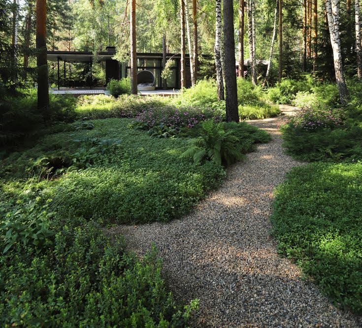 В 2025 году сад проектируют так, будто он вырос сам из природы, без помощи человека. Линии — плавные, посадки — хаотичные, но гармоничные. Вместо мощеных дорожек выбираем тропинки из гравия или декоративной каменной крошки, клумбы оформляем без симметрии.