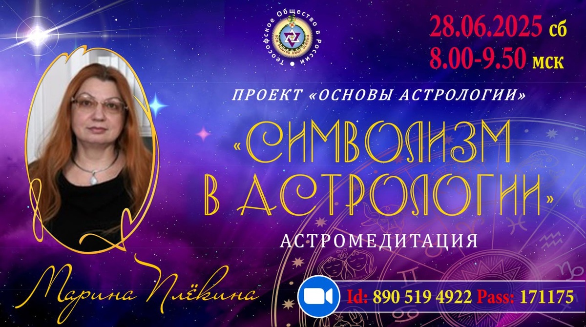 🪷🪷🪷Дорогие друзья, приглашаем вас принять участие в АСТРОЛОГИЧЕСКОЙ МЕДИТАЦИИ! 🌗ДАТА: 28 июня (суббота) 🌠ВРЕМЯ: 8:00 (мск). 🌐Быстрый вход в лекторий по ссылке: https://clck.ru/37Q6hC. ZOOM Id: 890 519 4922 Код: 171175 ✨ВЕДУЩАЯ: Марина Вячеславовна Плёкина, профессиональный астролог, психолог, нумеролог, космоэнергет, г.Москва. ❗️Добро пожаловать на новые официальные каналы ТО в России: ▫️Вконтакте: https://vk.com/theosophyrussia ▫️Дзен: https://dzen.ru/profile/editor/ts_russia ▫️YouTube: https://www.youtube.com/@TS_Russia ❗️Подписка на рассылку Теософского общества в России и по любым вопросам: secretary@ts-russia.org