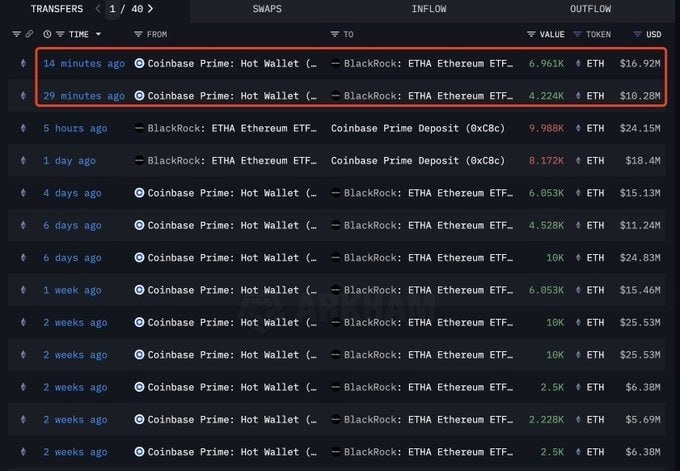За сегодня компания купила 11 185 ETH ($27,2 млн), которые вывели с Coinbase Prime.