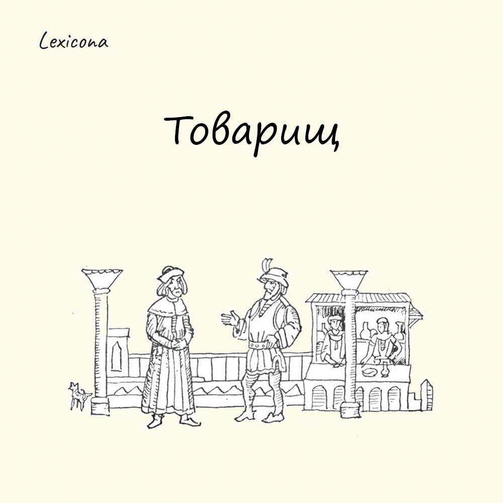имеет тюркское происхождение. Оно образовано от слова «tauar», что в переводе значит «товар». Так тюрки называли сам товар. После того, как слово перекочевало в древнерусский язык, оно стало иметь значение «повозка или обоз с неким товаром» и произносилось как «товарище». У купцов «товарищами» называли особенных людей, которые занимались контролем за товаром. Таким образом, первоначально товарищами назвали группу людей, занимающихся одним делом, связанным с торговлей.