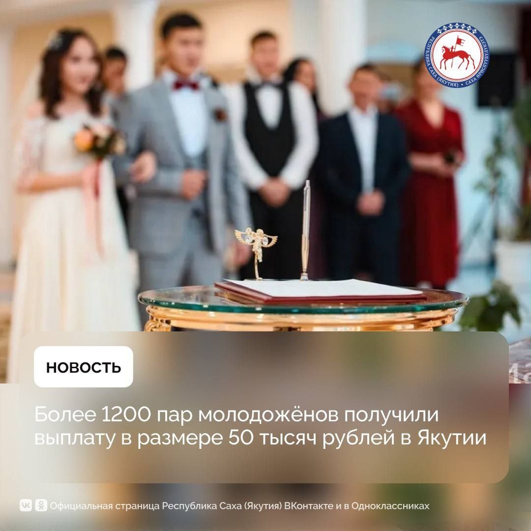 В Якутии единовременную денежную выплату в размере 50 тысяч рублей получили 1268 пар молодожёнов, вступивших в брак до 25 лет. Данная поддержка, инициированная главой региона Айсеном Николаевым, действует с января 2024 года. 🔹 Условием для получения выплаты является возраст обоих супругов не старше 25 лет, оба супруга должны проживать в Якутии, у обоих супругов это должен быть первый брак. 🔹 Заявление о предоставлении выплаты подаётся одним из супругов в управление социальной защиты населения и труда по месту жительства в электронном виде с использованием портала государственных и муниципальных услуг. Обратиться за выплатой можно в течение полугода с даты регистрации брака. 🔹 Выплата предоставляется в течение 10 рабочих дней. Мера государственной поддержки направлена на укрепление института семьи и содействие регистрации браков. #ПравительствоЯкутии