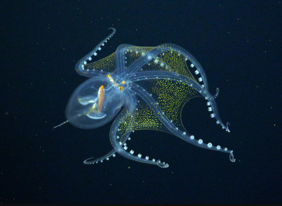 В глубинах океана, куда не проникает солнечный свет, развилась удивительная форма адаптации - полная или частичная прозрачность тела. Это явление особенно распространено среди организмов, обитающих в мезопелагической зоне (200-1000 метров) и батипелагической зоне (1000-4000 метров). В этих условиях, где зрение хищников адаптировано к улавливанию малейших контрастов, прозрачность становится идеальным камуфляжем. Физиологическая основа прозрачности глубоководных существ чрезвычайно сложна. Их ткани обладают особыми оптическими свойствами - показатели преломления цитоплазмы клеток и внеклеточных жидкостей практически идентичны показателям морской воды. Это достигается за счет специальных белковых структур и необычного состава клеточных мембран. Некоторые виды, такие как стеклянный кальмар (Teuthowenia pellucida), довели эту адаптацию до совершенства - их тело пропускает до 98% падающего света. Интересно, что многие прозрачные организмы сохраняют непрозрачные внутренние органы. Для маскиро
