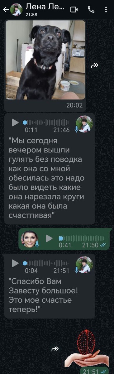 Лучшего и не пожелаешь 🥰 Не знала, как же вам передать голосовые с приветом от Весты. Расшифровала голосовые и сделала скрин. Хотя бы так. Про эту собаку другого и не ждала. Всё отлично 🙏🏻