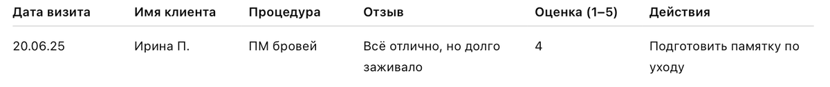 Часто владельцы салонов и клиник думают, что контроль качества — это просто раз в месяц просмотреть отзывы на Google или Яндекс. Но настоящий контроль — это система сбора и анализа обратной связи, благодаря которой вы: В этой статье: 👉 Когда клиенту звонят или пишут после визита, он чувствует, что о нём заботятся. Это повышает доверие, увеличивает шанс на повторную покупку и снижает количество негативных отзывов. 👉 А для владельца — это источник правдивой информации: не от администратора, не из чата, а от живого клиента. Здравствуйте, [Имя], это [Имя сотрудника] из [Название салона/клиники]. Хотим поблагодарить вас за визит к нам и узнать, как вы себя чувствуете после процедуры? (в зависимости от ответа) Нам важно ваше мнение, чтобы делать сервис ещё лучше. Подскажите, пожалуйста: