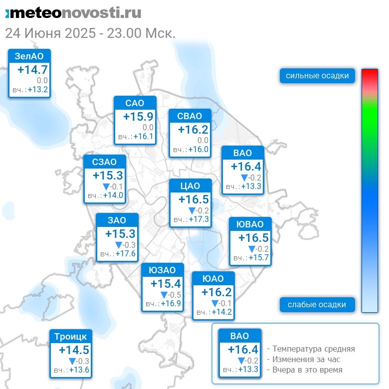 В 23:00 в Москве было от +14.5°C до +16.9°C, средняя температура +15.8°C #погода #Москва #лето #температура #24июня #вторник