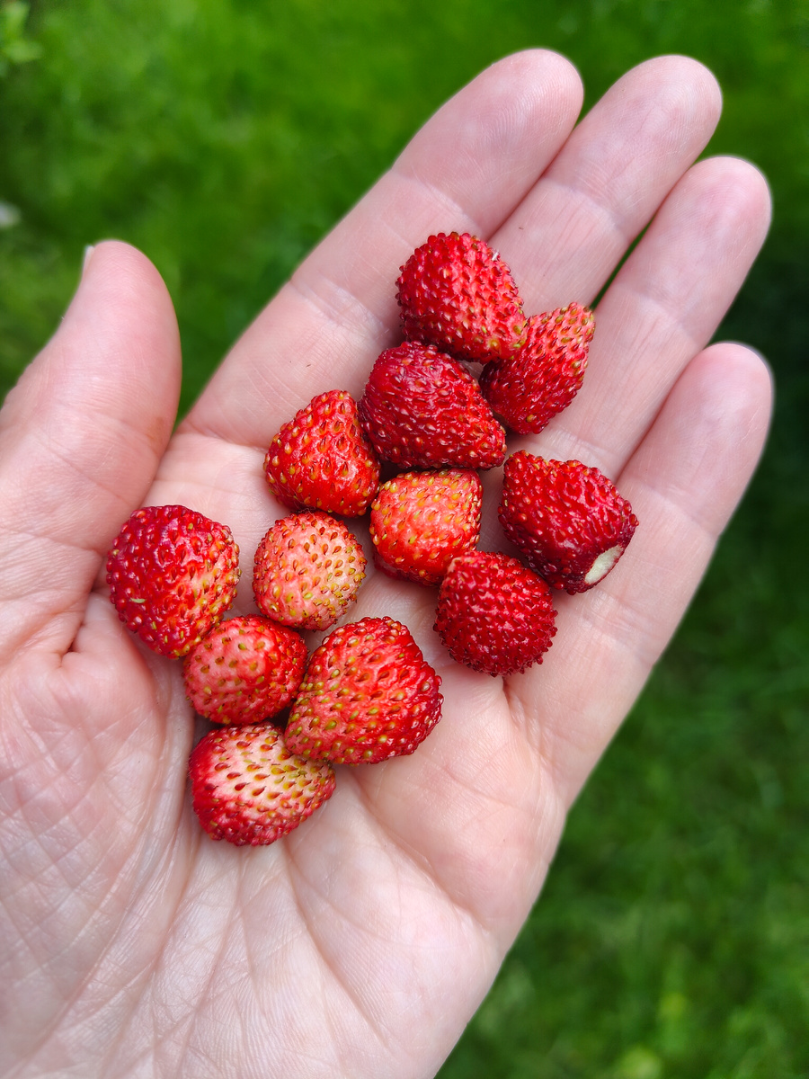Наконец-то начался землянично-клубничный сезон. Все уже давно хвастаются, а мне пока нечем было. Но теперь и моя очередь пришла. Земляника альпийская неизвестного сорта плодоносит уже примерно неделю. Но так как количество кустов у меня невелико, то и ягод, снятых за раз, тоже немного. Начала поспевать земклуника. У меня растёт сорт под народным названием Цыганка. У неё ягоды более крупные, чем у земляники и имеют дополнительный вкусовой оттенок. Правда, такие крупные ягоды только самые первые, остальные будут значительно мельче. У земклуники чашелистики загнуты вверх, поэтому собирать ягоду очень легко, она отрывается без них. Поспела такая долгожданная клубника. Я её ещё ни разу не пообовпла. Посажена она была в прошлом году. Усы приехали ко мне из Новосибирска по обмену. Первые ягодки передают привет БиоЛламе. Сорт интересный. Ягоды крупные, очень плотные, я таких раньше не встречала. Чашелистики отгибаются кверху, отделять их очень легко. Для сравнения я выложила по паре ягод к