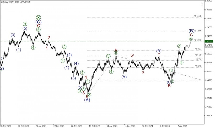 https://basechop.ru/wordpress/?p=47771 Рынок по Евродоллару в долгосрочной перспективе может формировать крупную бычью коррекция (B), которая принимает форму стандартного зигзага A-B-C. На сегодняшний день полностью завершены только первые две его части – импульс A и коррекция B. На последнем участке графика мы можем наблюдать развитие бычьей волны C, которая, по всей видимости, принимает форму импульса. На текущий момент завершены первые четыре его части – подволны [1]-[2]-[3]-[4]. В процессе построения ,бычья финальная подволна [5]. Большая вероятность, что быки внутри волны [5] смогут отправить рынок в область уровня 1.186. На указанной отметке величина крупной импульсной волны C составит 100% по расширению Фибоначчи от предыдущей импульсной волны A. Таким образом, при продолжении роста, стоит рассмотреть открытие длинных позиций с текущего уровня, с целью забрать прибыль на указанной отметке. После достижения уровня 1.186, ожидается смена тренда, а именно ожидается развитие…