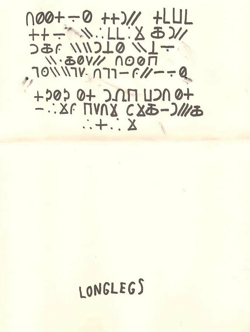 На каждом месте преступления - письмо, зашифрованное странными символами, как будто написано кем-то не совсем человеком. В дело вступает агент ФБР Ли Харлоу. Молчаливая, умная, сосредоточенная. Но чем дальше она копается в материалах, тем больше всё разваливается - не только дело, но и её восприятие реальности. Её преследует имя, которое появляется вновь и вновь: Longlegs.