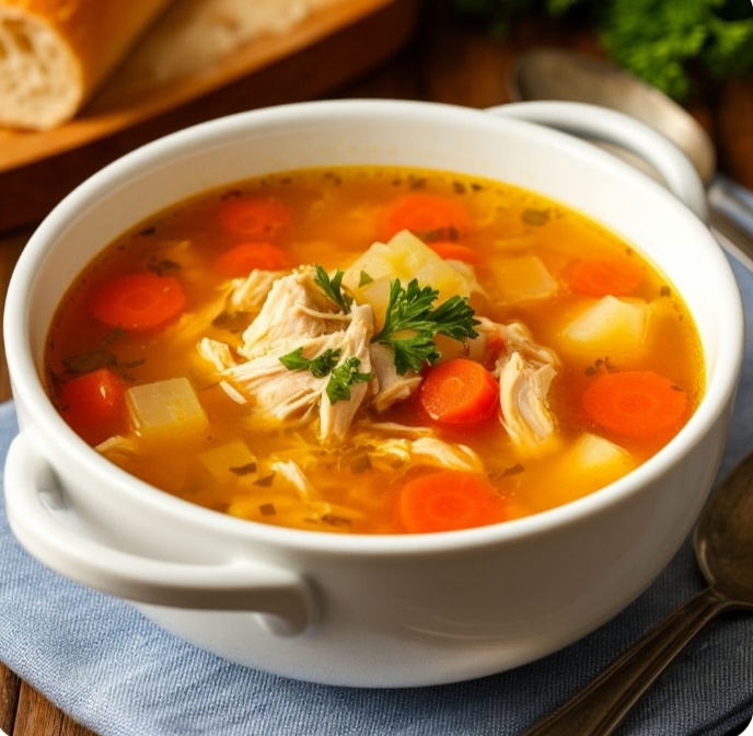 Готовится просто, но вкус поражает воображение. Ингредиенты: - Репчатый лук - 1 головка - Куриное яйцо - 1 штука - Пшеничная мука - 80 г - Курица - 1 штука (800-1200 г) - Морковь - 1 штука - Лавровый лист - 1 штука - Черный перец горошком - 3 штуки - Соль, укроп - по вкусу - Растительное масло - 1 ч. ложка Приготовление: 1. Смешать яйцо с маслом и мукой, замесить тугое тесто, оставить на 15 минут. 2. Раскатать тонко тесто, нарезать лапшу. 3. В кипящей воде (3 литра) варить курицу со специями и луком, морковью. 4. Через час вынуть ингредиенты, процедить бульон. 5. В бульон добавить лавровый лист и лапшу, варить 5 минут. 6. Подача: в тарелку кусочки курицы, зелень и бульон. Приятного аппетита! 🍲 #КуриныйСуп #ДомашняяЛапша #РецептыСупов #ВкусноИПолезно