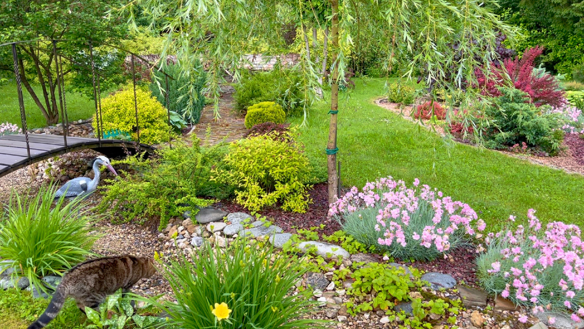 Грунт немного осел, и есть небольшое осыпание камней по берегам. Каждый год собираемся поправить берег, но так руки и не доходят. Там, где оголился геотекстиль из-за осыпавшегося камня, нарастает мох. Со мхом мы подружились, хотя сначала боролись и на газоне, и на дорожке, и в ручье, но поняли, что не победим и приняли это как данность.