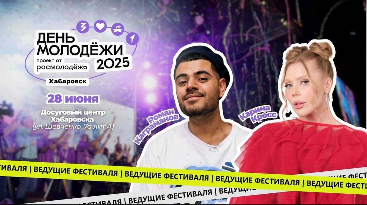 Фестиваль «День молодёжи-2025» пройдёт в Хабаровском крае 28 июня Он состоится во всех муниципальных образованиях края, но самая большая площадка откроется у Досугового центра в Хабаровске! Мероприятие будет разделено на четыре пространства: 1. «Знай»Здесь пройдёт карьерный форум с участием крупных работодателей; 2. «Гордись» Здесь будет интерактивная выставка «Герои СВО», мастер-классы; 3. «Люби» Здесь готовят тренировки и скалодром. 4. «Приумножай»Пространство объединит арт-практику на мегахолсте, мастерские. Ведущими станут Карина Кросс и Роман Каграманов. Для участия в фестивале необходимо пройти регистрацию на сайте деньмолодёжи2025.рф ⏩ На фестивале в Хабаровске выступит Миша Марвин — артист с миллионами прослушиваний и хитами, которые многие молодые знают наизусть. «Вдвоём», «Не надо быть сильной» — 28 июня вживую со сцены Дня молодёжи! Ждём всех на Комсомольской площади🩷 Не забудьте получить бесплатный билет. Без него вы не сможете попасть на фестиваль!