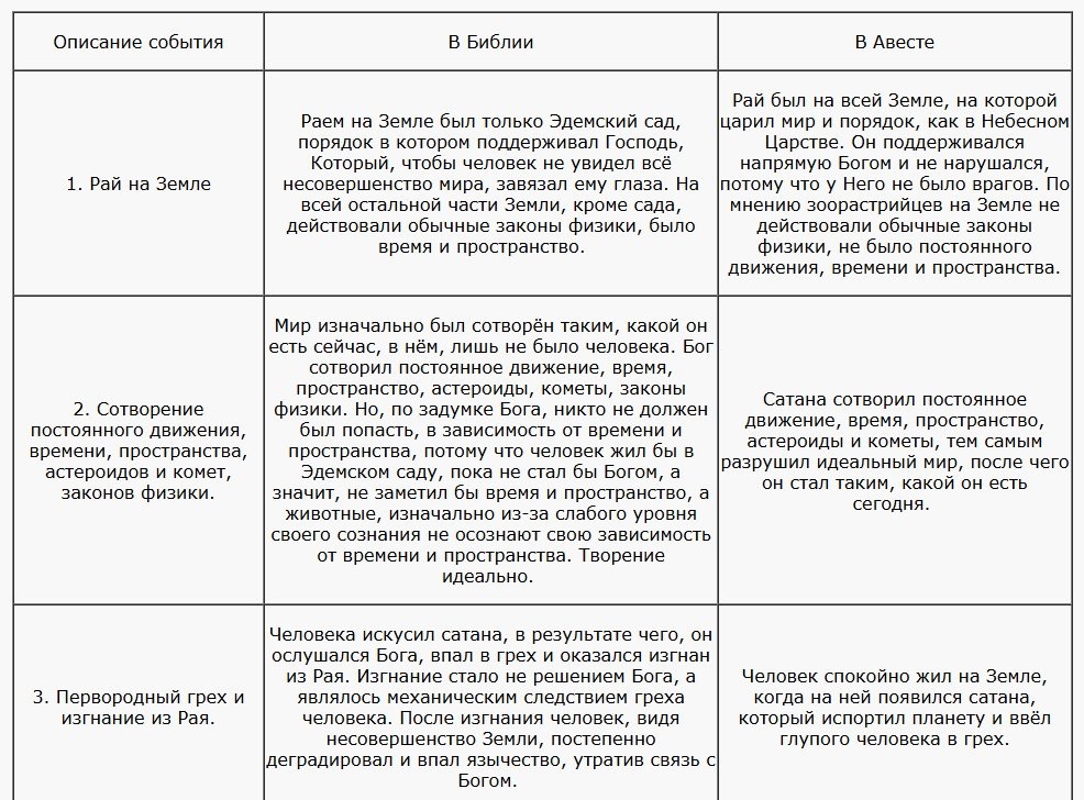 Сотворение мира в Авесте и Библии отличается двумя вещами. Прежде всего, это понимание человека. В христианстве присутствует такое понятие как, «Эдемский сад». Это место на Земле, куда был помещён человек, после сотворения. Оно было таким же прекрасным как Рай. На остальной части Земли, Рая не было, там господствовали обычные нам законы физики, но там не было и человека.