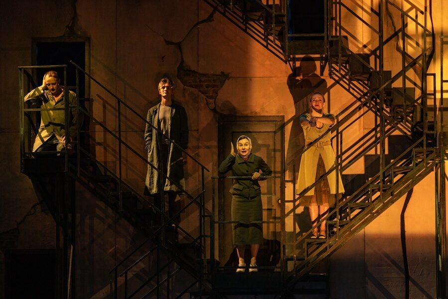 Как и подобает сну, время, пространство и материя тут живут по собственным законам, которые в любой момент готовы измениться. Как сами захотят. Пространство тут тоже японской работы — от сценографа Итаро Сугиямы. На вполне питерской громаде дома — причудливый железный иероглиф внешних лестниц и площадок с квартирными дверями, с подслеповатыми окошками уборных, с трещинами и сколами штукатурки. Такая достоевщина с транзитом до балабановщины. С промежуточной станцией Хармс.