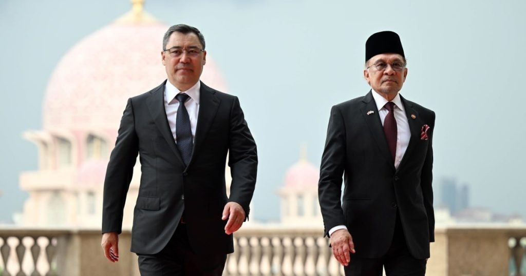 Бүгүн Путраджаяда Кыргызстан президенти Садыр Жапаров менен Малайзиянын премьер-министри Анвар Ибрагимдин расмий жолугушуу аземи өттү. Иш-чарада эки өлкөнүн гимндери ойнолуп, делегациялар тааныштырылды. 🇰🇬 Кыргызстан менен Малайзиянын жогорку деңгээлдеги жолугушуусу Путраджаяда өттү. 🤝 Президент Садыр Жапаров менен премьер-министр Анвар Ибрагимдин расмий жолугушуусу Малайзиянын премьер-министринин кеңсесинде, Пердана Путрада, өттү. 🎶 Жолугушуу учурунда эки өлкөнүн мамлекеттик гимндары жаңырды, ал эми президент Жапаровду Малайзиянын премьер-министри Анвар Ибрагим өзү тосуп алды. 👮♂️ Президент Жапаров Малайзиянын Ардактуу кароол ротасын кыдырып чыкты жана рота командиринин саламдашуу рапортун кабыл алды. 📚 Садыр Жапаров Малайзиянын премьер-министринин кеңсесиндеги Ардактуу коноктор китебине жазуу калтырды жана премьер-министрдин жеке кабинетин көрүп чыкты. 🗣 Жолугушуунун соңунда делегация башчылары сүйлөшүүлөр залында жолугушту.