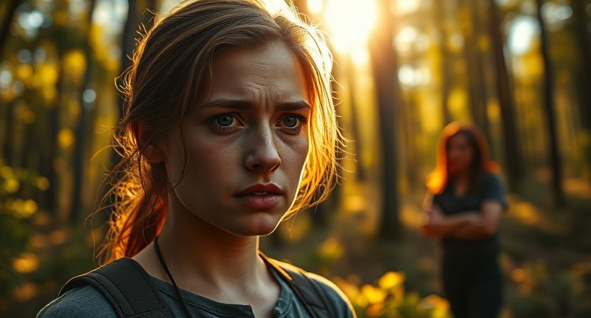 В лесу было волшебно! Птицы поют, солнце сквозь листву пробивается... Она даже закружилась от восторга, а потом замерла — голоса услышала. Две женщины шли, разговаривали: