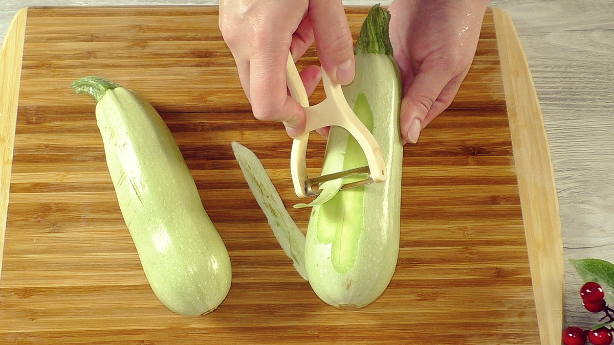 Берём кабачки, удалять кожуру или нет — решайте сами. Если они молоденькие, это не обязательно.