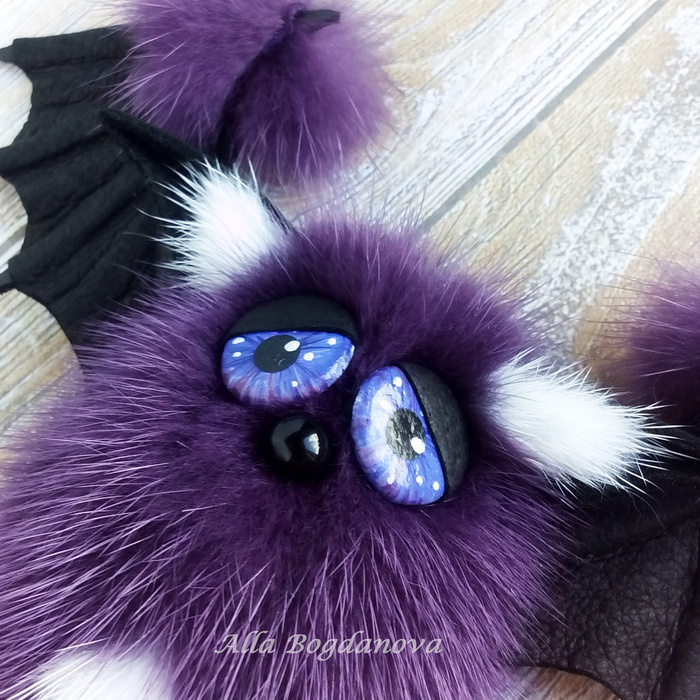 Несколько лет назад появилась идея, как раз все материалы были на руках и в итоге получилась Мышь летучая фиолетовая) Для тела использовала мех норки. Крылья делала из нескольких слоёв кожи: два снаружи и один внутри для придания жесткости; еще без проволочного каркаса и с "пушишками". Ушки лежат в разные стороны. Носик - бусинка. Глазки делала из пуговицы, обтягивала кожей и наносила рисунок акриловыми красками. Потом уже стала экспериментировать со стеклянными глазками. Крепить такую мышь можно было только за кольцо вверх тормашками, там потом карабин добавился. Выкройки и технологию пошива придумывала сама, вдохновлялась интеренетом и фотографиями летучих мышек) Мордашка в целом умилительная получилась, надо как-то повторить)