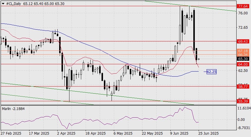 https://basechop.ru/wordpress/?p=47801 Нефть (#CL) За 2 дня головокружительного падения цена достигла целевой уровень 64.00, бывший сильной поддержкой в марте-апреле 2023 года и сопротивлением мая текущего года. Падение приостановилось на индикаторной линии баланса с разворотом вверх осциллятора Марлин дневного масштаба. Возможна коррекция в диапазон 66.34-67.18 – он играл роль продолжительной поддержки с октября по декабрь 2024 года. В дальнейшем мы ждём продолжение нисходящего движения, так как цена сформировала широкий нисходящий канал (зелёного цвета). Новая волна падения возможна после преодоления линии Крузенштерна (62.25), что вряд ли произойдёт в ближайшие дни. Сохраняем сдержанный оптимизм в достижении цели 58.77. На четырёхчасовом масштабе цена сильно уменьшила волатильность, что является характерным признаком коррекции. Осциллятор Марлин усиленно растёт, стремясь сбросить напряжение для подготовки в ожидаемому новому снижению. Вероятно, цена сможет отработать целевой диапа