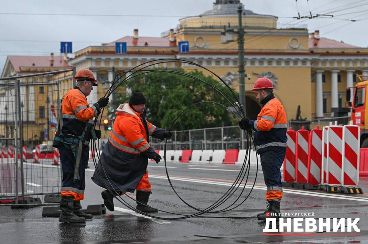 🛠 Дворцовый мост готовят к празднику «Алые паруса» В преддверии торжества сотрудники Энергохозяйства СПб ГУП «Горэлектротранс» демонтировали контактную сеть на Дворцовом мосту. Это необходимо для проведения светового шоу и установки пиротехники на разводной части переправы. Всего было снято 320 метров провода и 600 метров троса. Работы проводятся ночью, чтобы не нарушать дневное движение. После завершения праздника, 29 июня, контактную сеть восстановят. На Троицком мосту контактная сеть будет отключена, но не демонтирована. Фото: Александр Гальперин Петербургский дневник