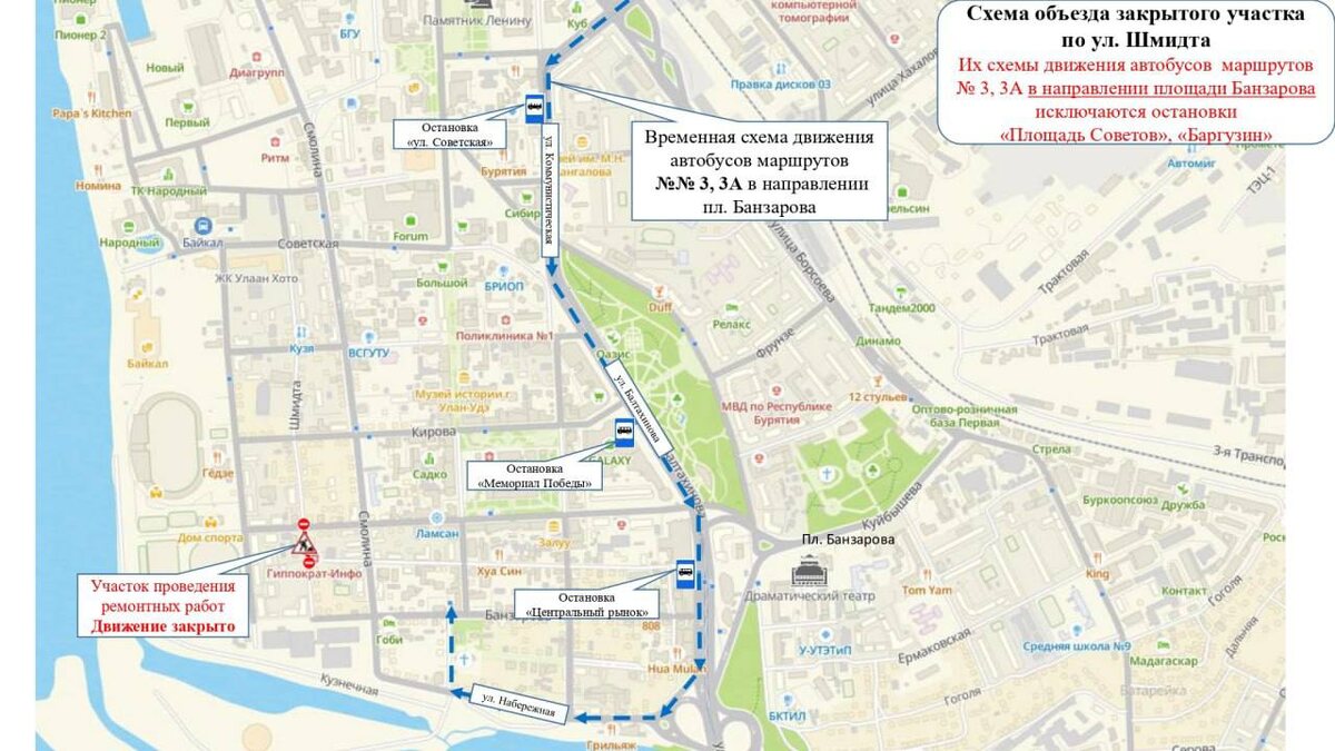Объезд закрытого участка дороги будет организован следующим образом: в сторону конечной остановки «Площадь Банзарова» автобусы пойдут через проспект 50-летия Октября — ул. Коммунистическая — ул. Балтахинова — ул. Набережная, далее следуя до площади Банзарова. Обратное направление останется прежним, сообщили в Комитете по транспорту.