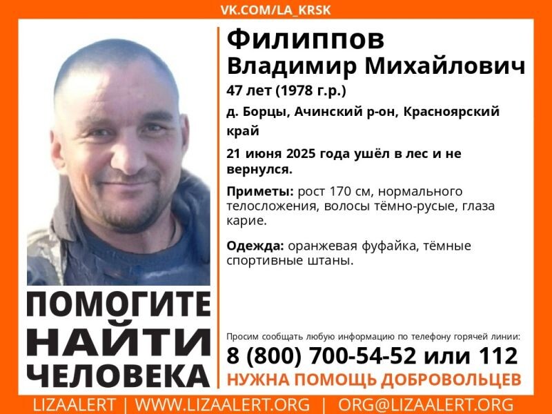 ❗️В Ачинском районе с 21 июня разыскивают ушедшего в лес Владимира Филиппова Как сообщает поисковый отряд «ЛизаАлерт», 21 июня 47-летний Владимир Филиппов ушел в лес из деревни Борцы, и с тех пор о его местонахождении ничего неизвестно. Приметы: рост 170 см, нормального телосложения, волосы темно-русые, глаза карие. Был одет: оранжевая футболка, темные спортивные штаны.