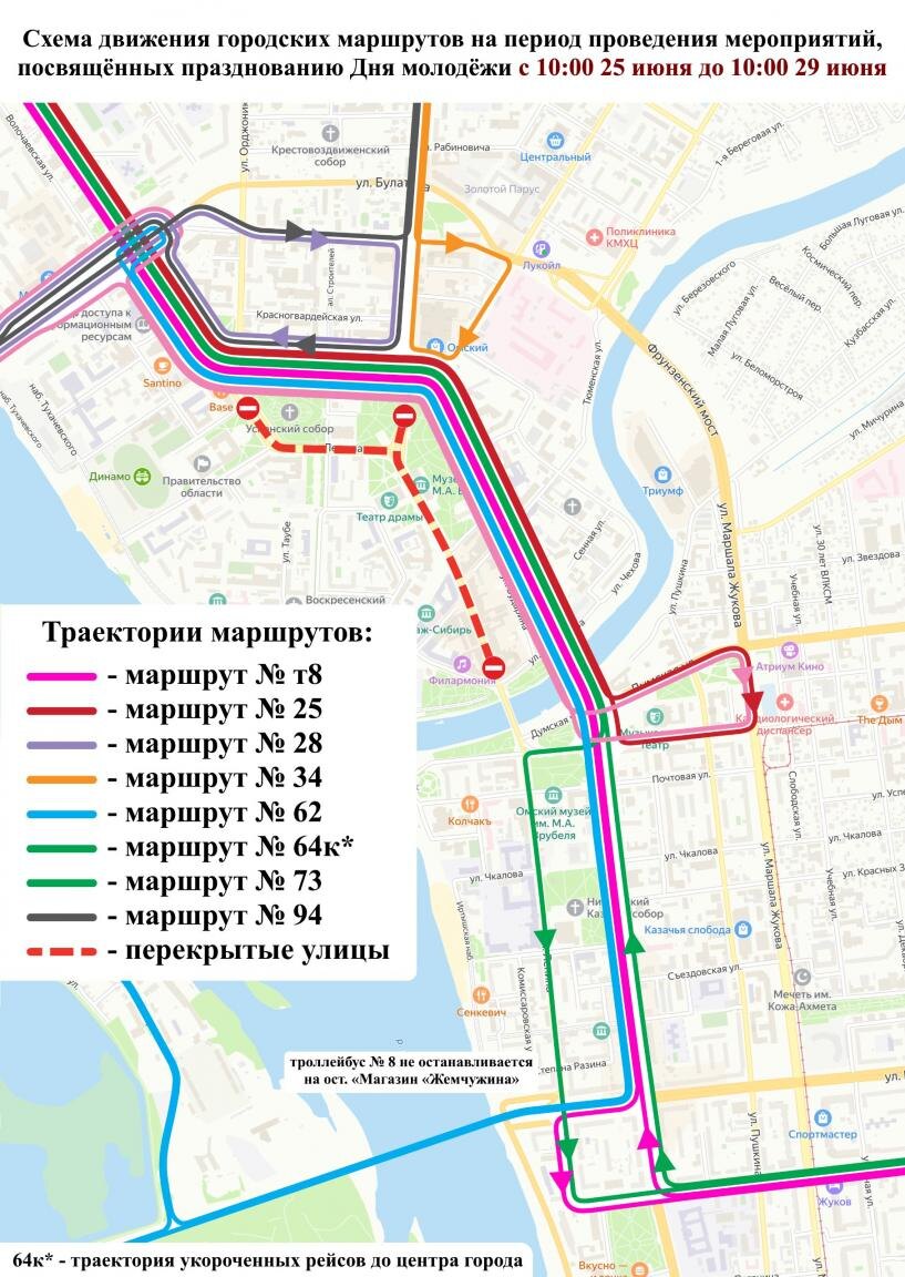 - Автобусы маршрутов № 25 и 77, а также укороченные рейсы № 64 будут останавливаться на ООТ «Дом Туриста», а разворот автобусов будет организован через Комсомольский мост, улицы Думскую, Маршала Жукова и проспект Карла Маркса.
