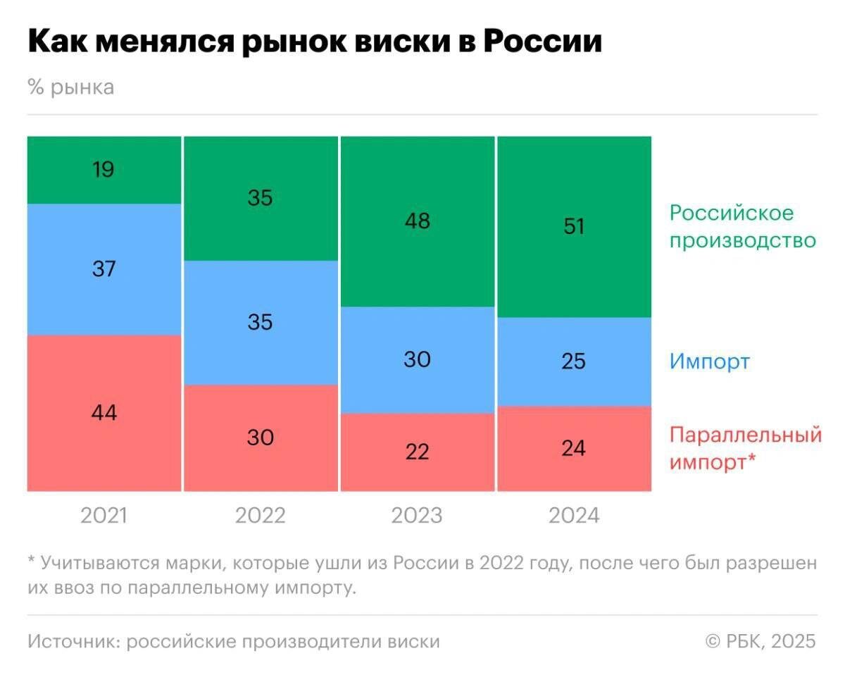 Отечественный виски занял больше половины российского рынка По итогам 2024 года на него пришлось уже 51% всех продаж. Для сравнения, еще в 2021 году доля была всего 19%. Импорт сократился до 49%, при этом параллельный импорт крупных брендов вроде Johnnie Walker или Jack Daniel’s занимает лишь 24% рынка. Параллельно с этим потребление виски в России растет: 9,75 млн декалитров за 2024 год против 6,78 млн в 2022. Воспользовавшись уходом крупных игроков, производители из Китая, Индии и других стран стараются занять освободившиеся ниши, но закрепиться удается не всем. Российский виски выигрывает за счёт цены. Бутылка 0.5 л в среднем стоит 600–900 рублей, тогда как импорт часто в полтора-два раза дороже. Согласно прогнозам, уже в ближайшие годы российский продукт может занять заметную долю и в среднем ценовом сегменте. https://www.rbc.ru/wine/news/6853c6eb9a7947450300480a?from=from_main_11