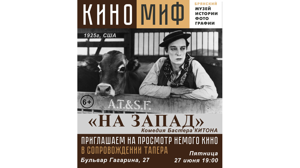 Музей истории фотографии приглашаем брянцев на киносеанс. Он состоится в пятницу, 27июня. Начало в 19 часов. В рамкам проекта «КИНОМИФ» будут продемонстрированы публике шедевры немого кино в сопровождении тапера. Все как в старые добрые времена начала XX века, черно-белая картинка с титрами и живая музыка. Проверенное временем кино – классическая немая кинокомедия 1925 года с участием Бастера Китона. «На запад» – фильм про молодого человека, который не может найти работу в своём родном городе и поэтому решается ехать на запад. 6+ ФОТО: МИФ — Музей Истории Фотографии | Брянск Брянске состоится показ немого кино в сопровождении тапера