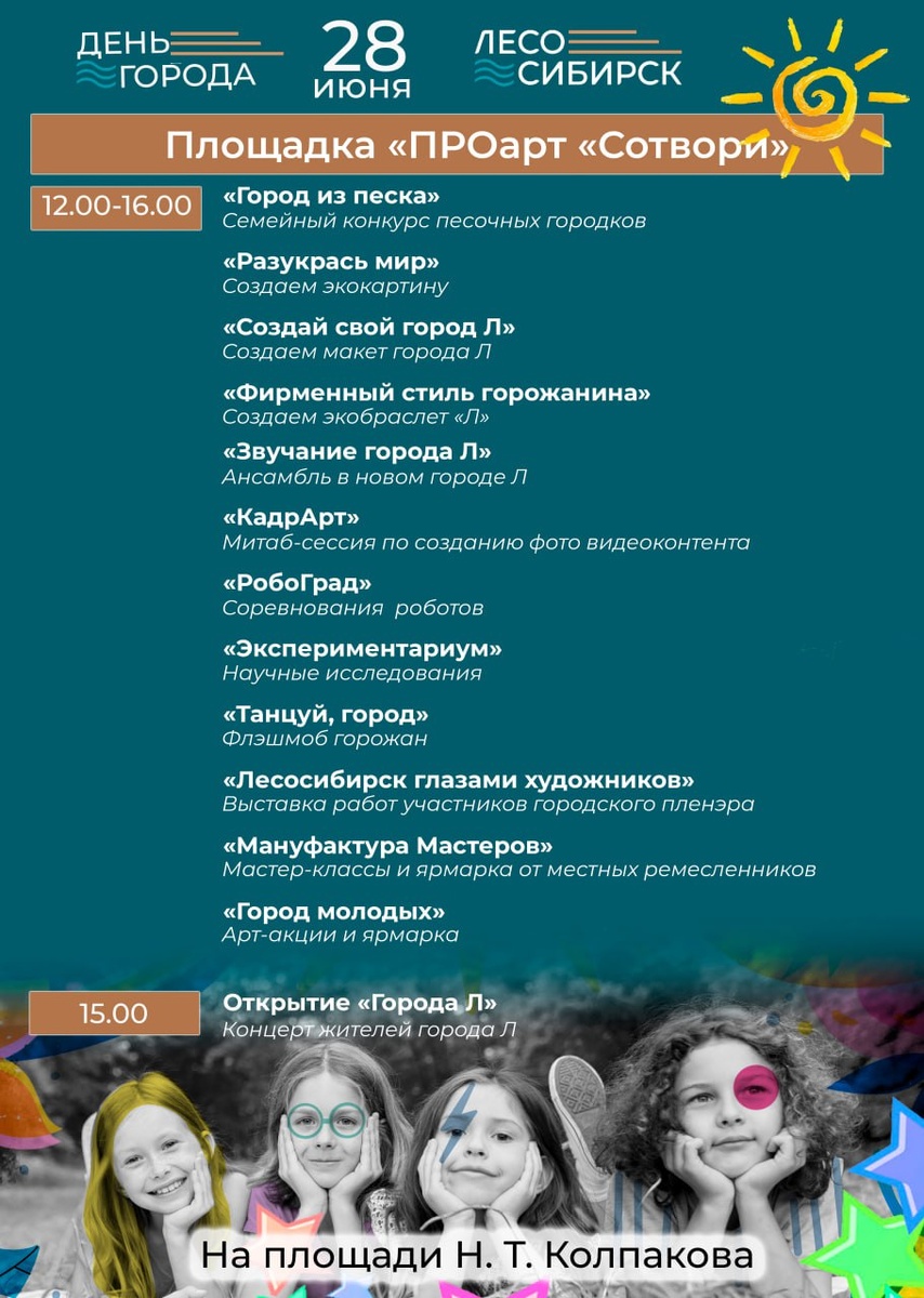 Администрация Лесосибирска приглашает вас на площадку — «ПРОарт «Сотвори», которая будет работать 28 июня в День города!