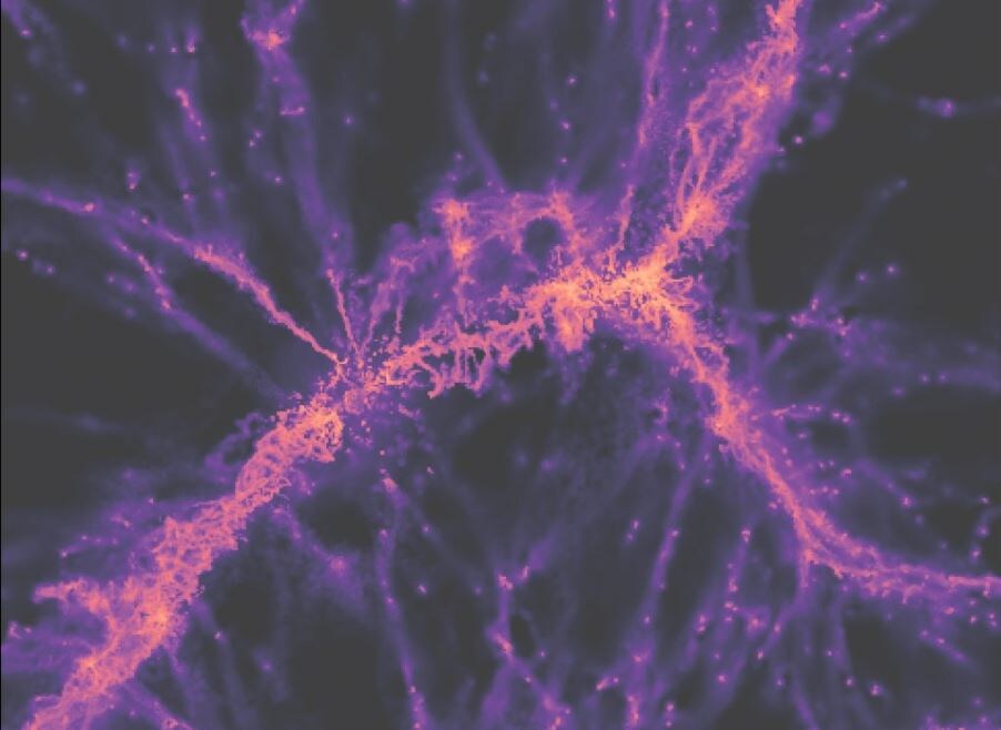 Тёмная материя, во всяком случае в рамках представлений о её природе на данный момент «классических», в силу слабости слабого взаимодействия между частицами к коллапсу не склонна. Но, поскольку к гравитационному взаимодействию она способна, «светлая» материя потянула её в филаменты за собой.