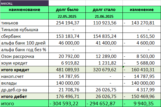 Привет всем! Вот и готовы результаты ещё одной недели нашего марафона. Но сначала я кратко расскажу о своём личном результате. Так как на этой неделе было 22 число, а у меня это день списания платежа и, соответственно, день отчета за месяц. Вот моя табличка: Да, я отчитываюсь за месяц, а не за неделю. За неделю Я погасила 4797р, что будет видно в общей таблице. Но для меня важно подводить отчет ещё и за месяц. На начало месяца долг был 304593р. Платеж по моему собственному графику - 7615р. А погасила я 9940р. Теперь ежемесячный платеж на последующие периоды будет 7556р. Цель - уменьшать его насколько возможно. Осталось платить 39 месяцев. Ну и ещё из хороших новостей это то, что я разменяла тройку. Теперь мой долг не 300+ тысяч, а 200+ тысяч! Ну а вообще хотелось бы уже сменить цвет. До этого мне осталось погасить ещё 3,73% от долга (13960 рублей). Сводная таблица: В прошлый раз мы попрощались с участницей Татьяной Скоробогатовой. И на освободившееся место вступает Мадемуазель Полина