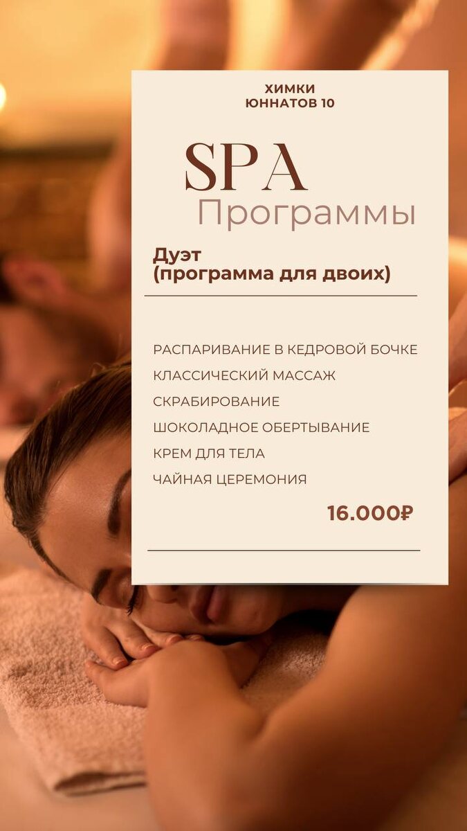 💆♀️ Что вас ожидает: ✔️ Распаривание в кедровой бочке ✔️ Классический массаж ✔️ Глубокое скрабирование ✔️ Шоколадное обертывание ✔️ Нанесение питательного крема ✔️ Завершение – чайная церемония 🌿 Программа «Дуэт» — это не просто СПА, это эмоции, тепло и восстановление на двоих. https://n960947.yclients.com
