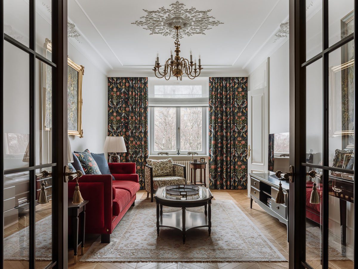 Квартира на Университетском проспекте - это уникальный авторский арт-проект. Яркая, акцентная квартира в Москве дома 1957 года постройки, наполненная картинами, предметами искусства и при этом очень комфортная для жизни. "Хозяйка квартиры - яркая, красивая и энергичная - сразу зарядила меня своей энергией на создание интересного проекта", - вспоминает дизайнер Татьяна Красикова. "В ее личной коллекции были картины, предметы искусства, люстры, которым она хотела найти достойное место в своем доме". Понимания, каким именно должен быть интерьер, у хозяйки квартиры не было. Но он точно не должен был быть скучным и узнаваемым и не должен был включать в себя мебельные гарнитуры. Хотелось ощущения эклектичности, сочетания вещиц с разной историей. В этом вопросе она полностью доверилась дизайнеру. Ее пожеланием было использовать максимально натуральные фактуры в отделке и оформлении квартиры. Большие арочные двери тоже были мечтой хозяйки - парадные, с интересным цветовым решением. Кроме того, квартира должна быть комфортной и для проживания, и для приема гостей.